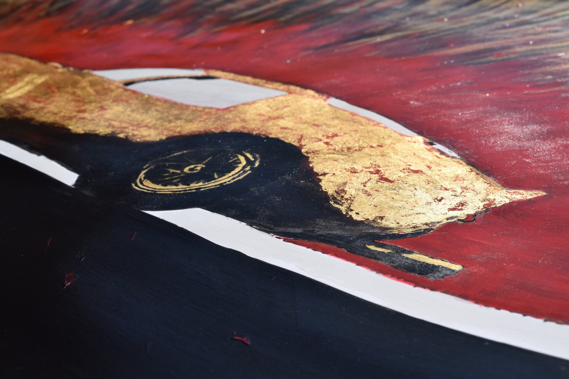 The base of the painting is created with acrylic. But the main character, the Ferrari 250 GTO, is completely covered with 24k gold. The painting measures 50 x 70 cm.